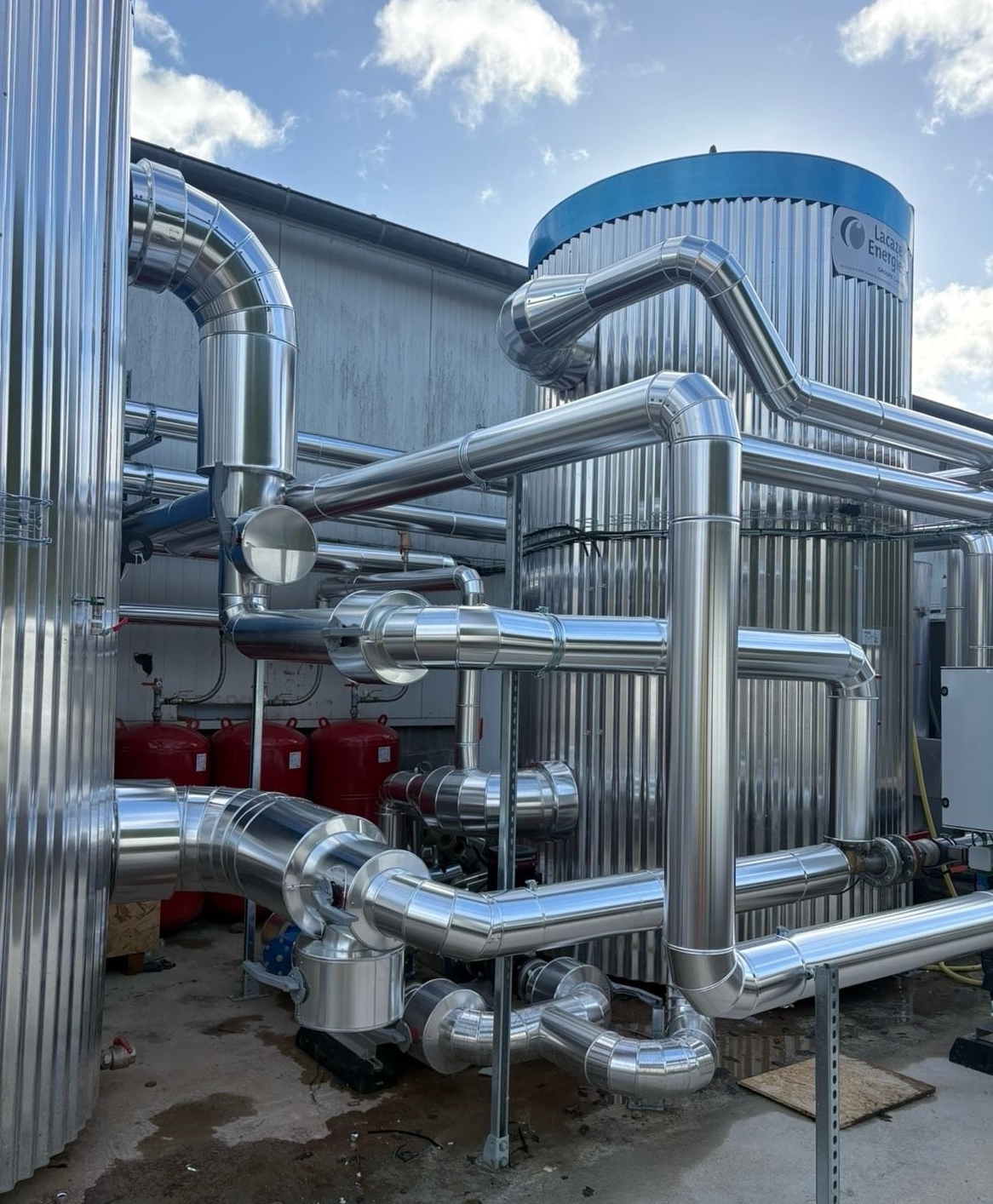Pour limiter les déperditions thermiques, notamment lors de la circulation de l’eau chaude à l’extérieur du bâtiment, le calorifugeage des réseaux a été confié à notre sous-traitant CG ISOL. Cette intervention permet de réduire les pertes énergétiques et d’améliorer l’efficacité globale de l’installation.